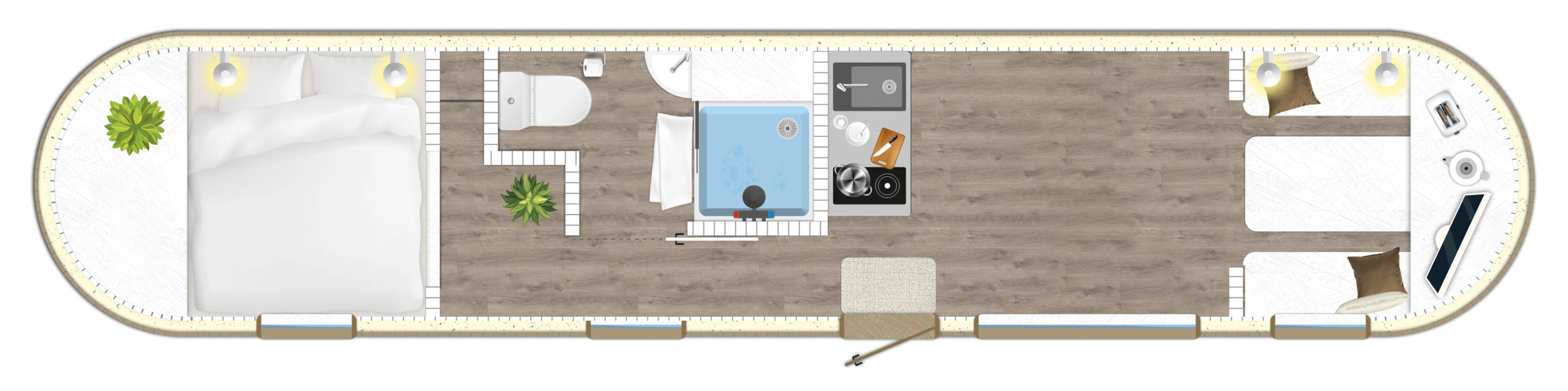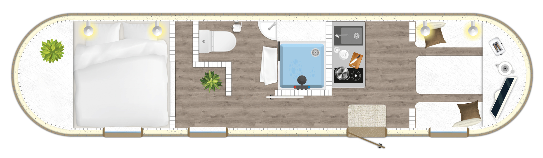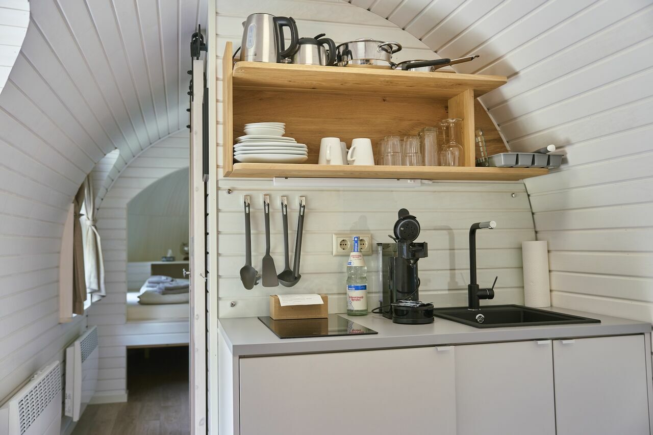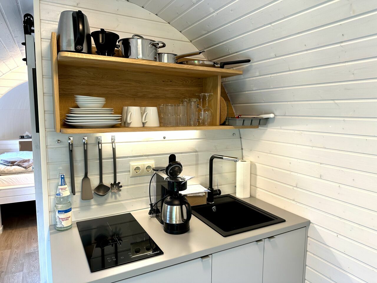 • Küche: Eine kleine Küchenzeile mit Spülbecken und Doppelkochplatte bietet die Möglichkeit ein Frühstück oder eine kleine Mahlzeit zu zubereiten. Ein geräumiger Kühlschrank unter der Kochplatte bietet Platz für frische Waren und kalte Getränke.