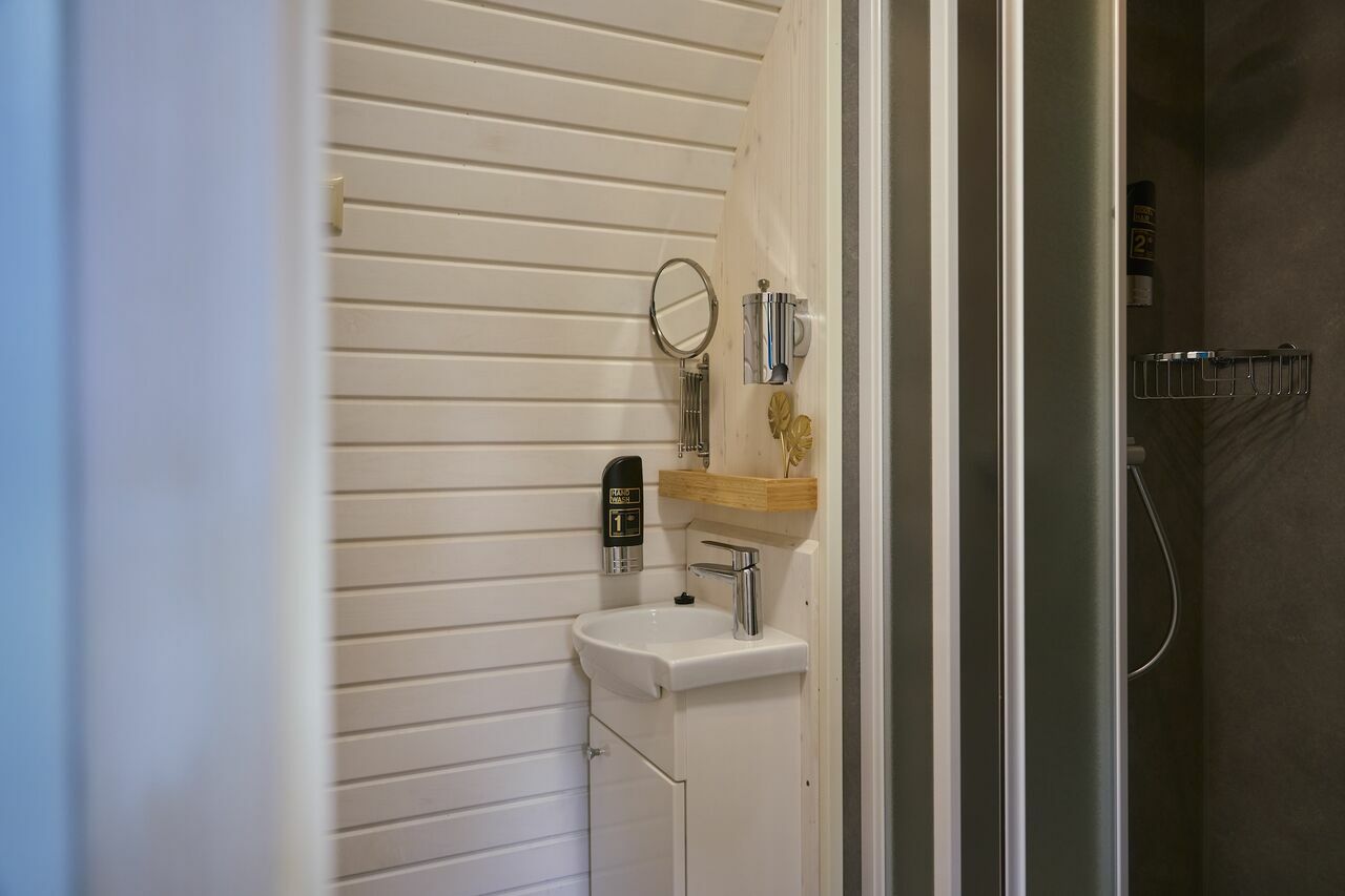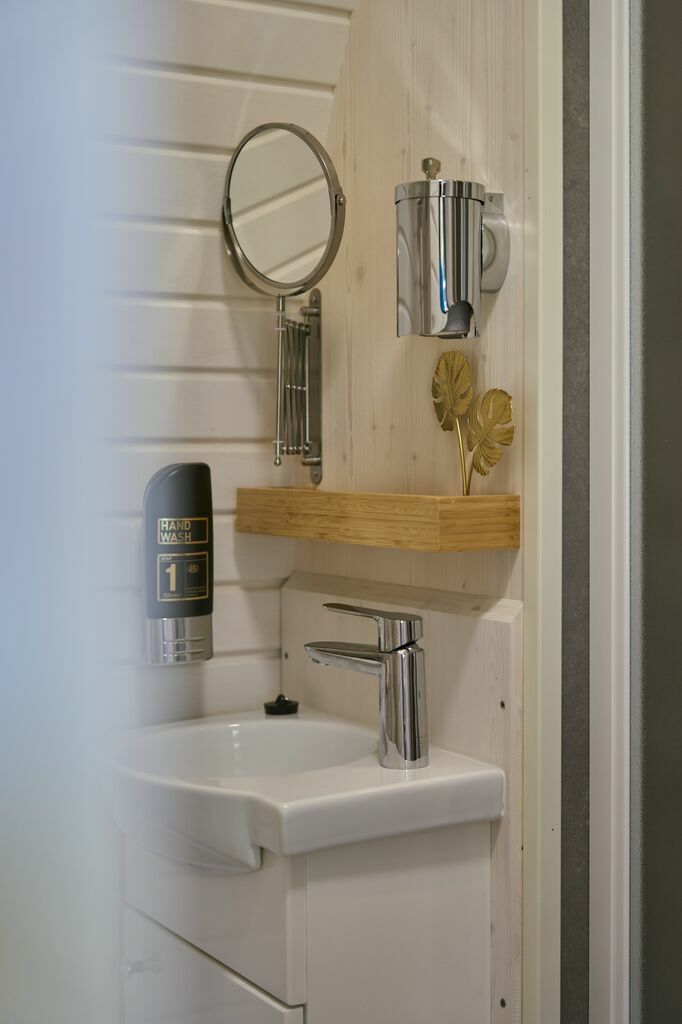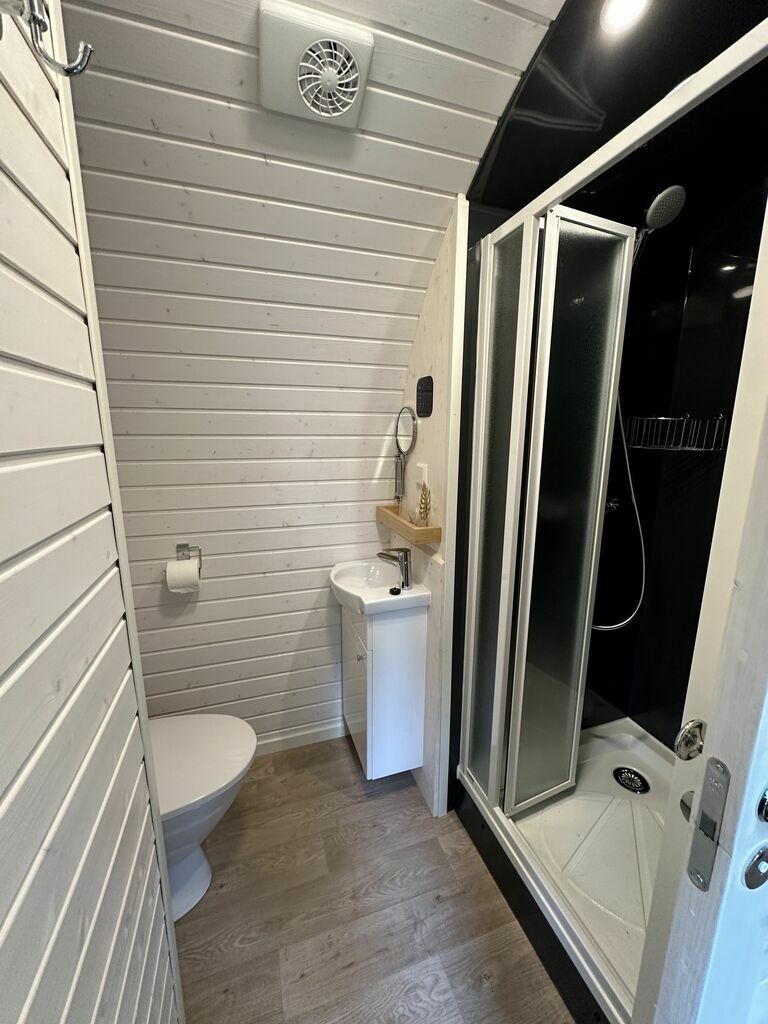 • Badezimmer: Hinter der Schiebetür befindet sich ein Badezimmer mit Dusche, Waschplatz und Toilette.