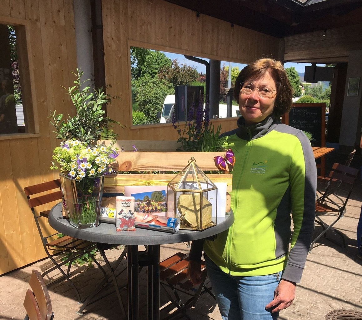 Seit 2004 stand Ursel unseren Gästen in der Rezeption bei Fragen rund um den Aufenthalt telefonisch, schriftlich oder persönlich mit viel Leidenschaft und Herz zur Verfügung. Als Kollegin mit enormem Erfahrungsschatz und geballtem Wissen rund um den Camping Kirchzarten war sie stets eine geschätzte und zuverlässige Ansprechpartnerin. Auch unsere Gäste konnten es nicht recht glauben, als wir gestern in geselliger Runde ausgelassen und ein bisschen wehmütig Ursels Abschied und Neustart als Rentnerin feierten.